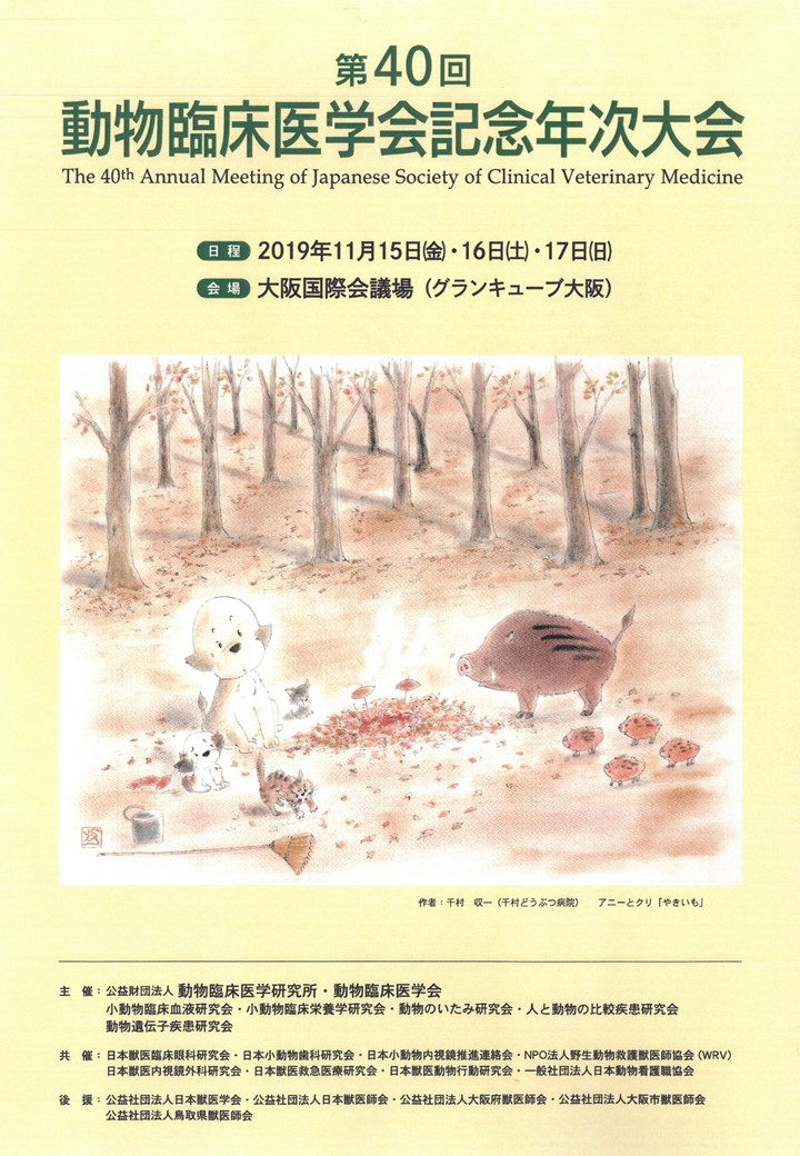 動物臨床医学会・(公財)動物臨床医学研究所様主催にて「第40回 動物臨床医学会 記念年次大会」が開催されます。今年は40周年記念大会として、特別講演として「猫の画期的な腎臓病の治療薬であるAIM」のご講演を、東京大学の宮崎徹先生(医師)にお願いしました。そして、市民公開講演として動物愛護を取り上げ、WVA(世界獣医師会)会長のJohnson Chiang先生「世界の動物愛護の現状」など、様々なシンポジストよりご講演を頂きます。